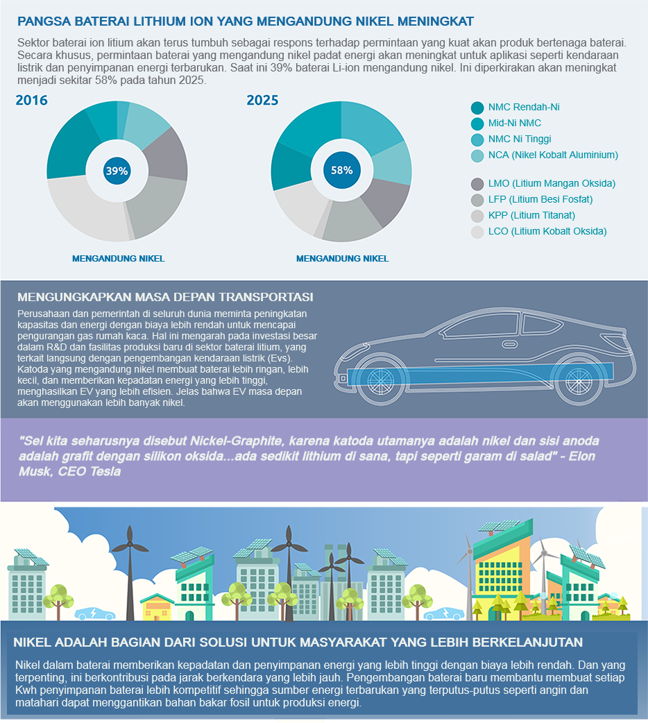 Nikel juga digunakan di sektor industri untuk mengurangi penggunaan bahan bakar, konsekuensi lingkungan, dan kehilangan pengiriman. Ini juga banyak digunakan dalam produksi baterai berbasis nikel kepadatan tinggi untuk memenuhi permintaan daya yang meningkat. Selain itu, ekspansi industri baterai dan mobil listrik saat ini diperkirakan akan meningkatkan permintaan teknologi Li-ion NCA dan NCM, yang menghasilkan peningkatan signifikan di pasar nikel dunia di tahun-tahun mendatang.