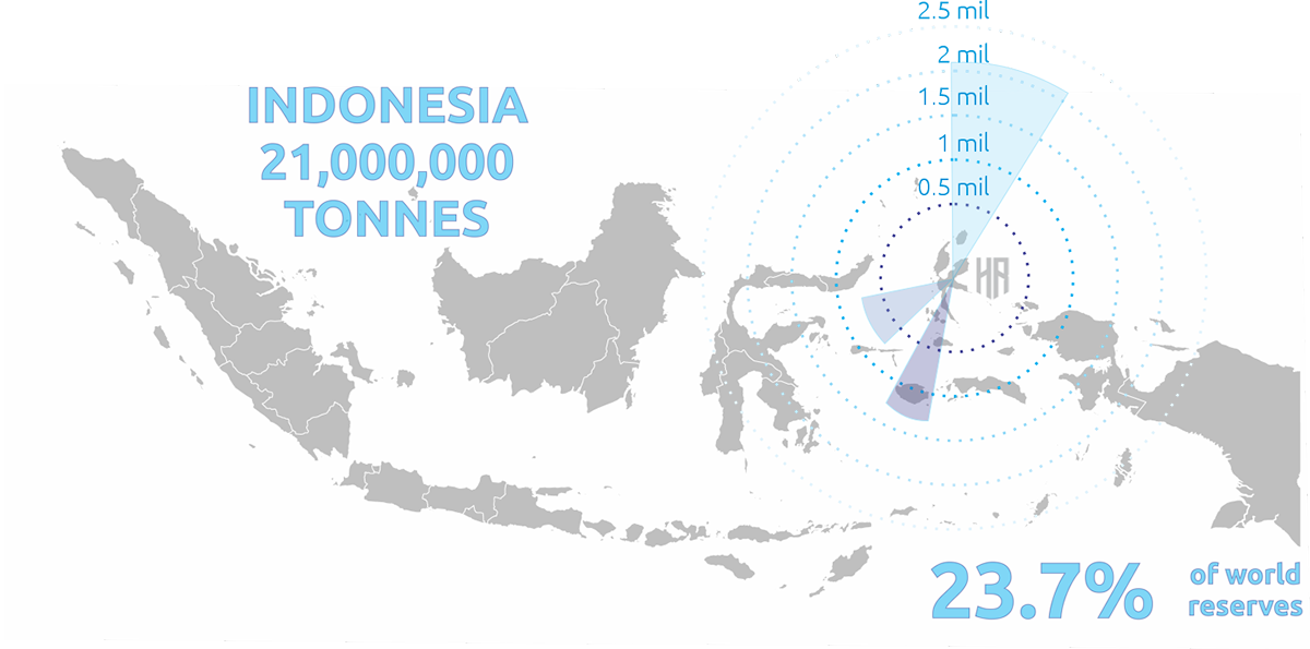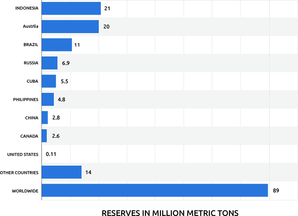 Indonesia, Filipina, Rusia, Kaledonia Baru, dan Australia adalah negara pertambangan nikel teratas. Indonesia juga memiliki cadangan nikel terbesar di dunia, diikuti oleh Australia dan Brazil. Cadangan nikel termasuk di antara logam dan mineral dengan sisa tahun hidup terpendek, namun hal ini kurang menjadi perhatian karena nikel merupakan komoditas yang sangat dapat didaur ulang.