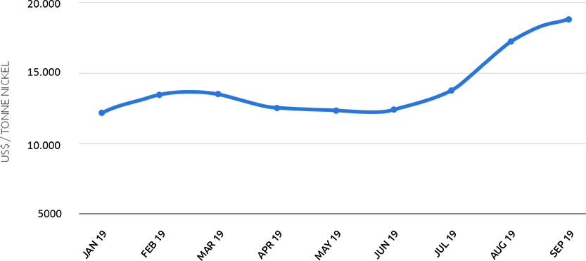 Harga nikel melonjak ke level tertinggi dalam 16 bulan pada Agustus 2019, di atas $16.000 per ton di bursa utama. Pada hari-hari awal bulan September 2019, harga naik lebih tinggi lagi, mencapai dan melampaui $18.000 per ton.